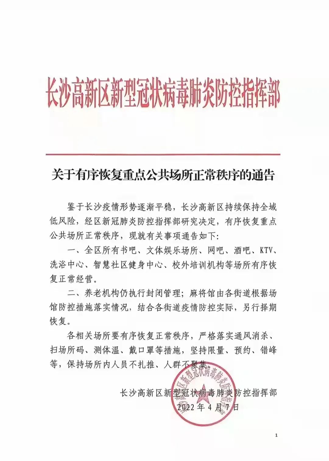 鉴于长沙疫情形势逐渐平稳,长沙高新区持续保持全域低风险,经区新冠肺炎防控指挥部研究决定,有序恢复重点公共场所正常秩序,现就有关事项通告如下: