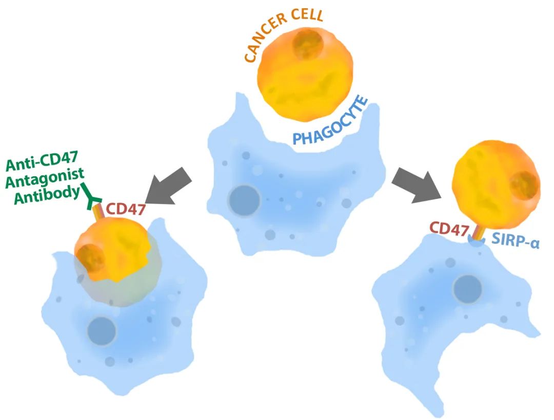 CD47在多种实体瘤(如卵巢、肺、肝脏、胰腺、乳腺、结肠及胶质瘤)细胞及恶性血液瘤(如急性骨髓性白血病、淋巴细胞白血病,及非霍奇金淋巴瘤)细胞上呈现高表达,而且其表达水平与疾病进展呈正相关。当CD47与其巨噬细胞上的受体SIRPα结合时,发出“不要吃我”的信号,使肿瘤细胞免于巨噬细胞的免疫攻击,实现免疫逃逸。