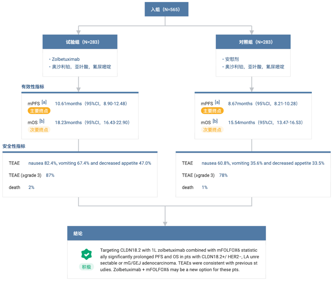 探索了 Zolbetuximab 联合 mFOLFOX6(奥沙利铂、亚叶酸 + 氟尿嘧啶联合方案)一线治疗 CLDN18.2 阳性、HER2 阴性局部晚期不可切除或转移性胃或胃食管交界处腺癌的疗效和安全性。
