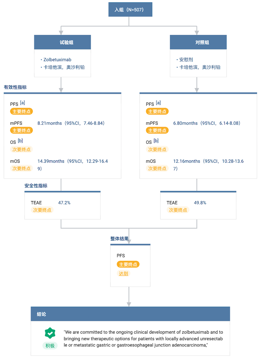 结果显示达到主要研究终点,与安慰剂组相比,Zolbetuximab 联合 CAPOX 将疾病进展或死亡风险降低了 31.3%(HR=0.687;95% CI: 0.544-0.866;p=0.0007)。治疗组的中位 PFS 为 8.21 个月,安慰剂组为 6.80 个月。