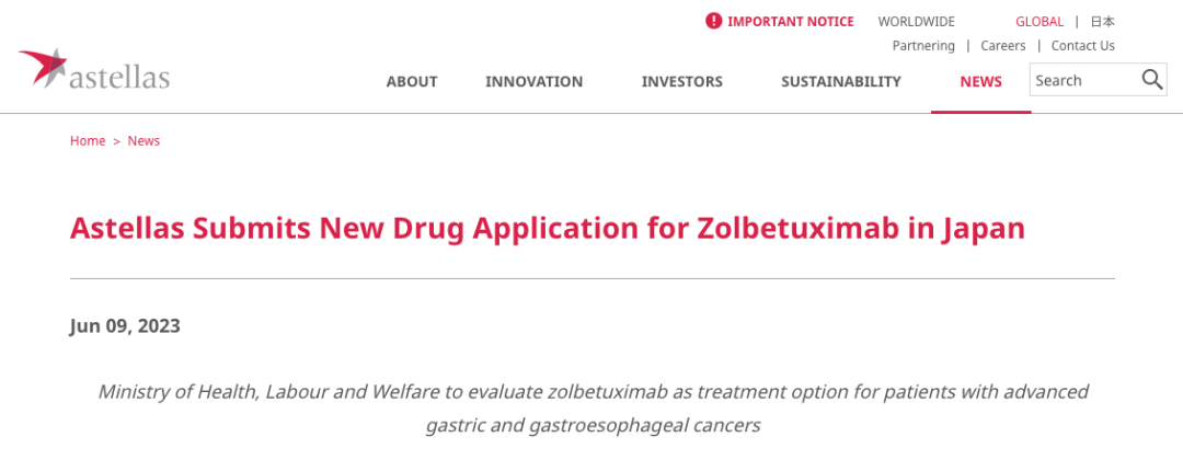 6 月 9 日,安斯泰来宣布,已向日本厚生劳动省提交了 Zolbetuximab 的新药申请(NDA),拟用于一线治疗 CLDN18.2 阳性、HER2 阴性的局部晚期不可切除或转移性胃或胃食管交界处(G/GEJ)腺癌。如顺利获批,Zolbetuximab 将成为全球首个获批的 CLDN18.2 靶向疗法。