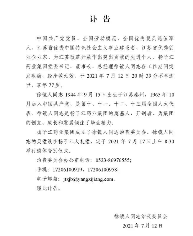 7月12日夜间,扬子江药业集团对外发布《讣告》和《关于成立徐镜人同志治丧委员会的通知》称,扬子江药业集团党委书记、董事长、总经理徐镜人于当日20时39分不幸逝世,享年77岁。