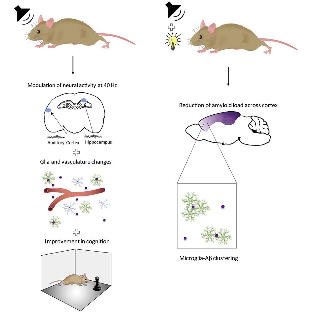▲40Hz的声音刺激和声光刺激在小鼠AD模型中改善动物认知能力,提高淀粉样蛋白的清除(图片来源:参考资料[2])