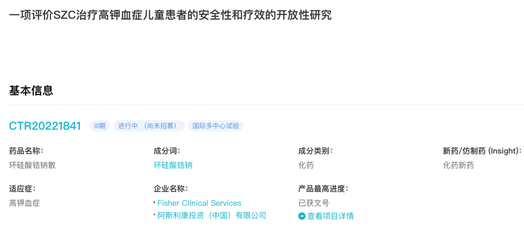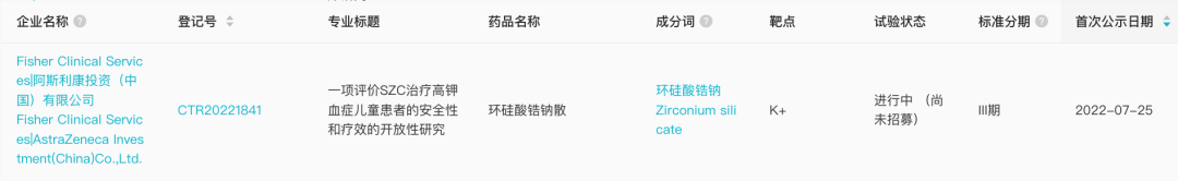 7 月 25 日,据 Insight 数据库显示,阿斯利康环硅酸锆钠在国内启动一项 III 期临床(登记号:CTR20221841)。