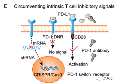 最近的研究集中在使用基因沉默技术,例如CRISPR / Cas9或短发夹RNA(shRNA),直接敲除CAR T细胞中编码抑制性受体PD-1的基因。例如,一组通过CRISPR/Cas9使抗CD19 CAR T细胞中的PD-1沉默,并在PD-L1阳性肿瘤模型中显示出挽救的T细胞活性和提高的抗肿瘤功效[61]。MSLN CAR T细胞沉默PD-1基因导致内源性PD-1水平下调,T细胞扩增增强和肿瘤细胞裂解[62]。