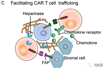 为了增强迁移和浸润能力,另一种可能的方法包括通过设计CAR T细胞识别基质细胞相关抗原或分泌基质降解酶来破坏实体瘤中的物理屏障(图1C)。有吸引力的靶标之一似乎是蛋白酶成纤维细胞活化蛋白(FAP),它在许多实体瘤中的成纤维细胞上表达[40]。此外,在多种肿瘤模型中对FAP CAR T细胞的评估显示出有效的肿瘤抑制作用和FAP阳性基质细胞数量的减少[41]。在另一项研究中,肝素酶(HPSE)修饰的CAR T细胞旨在补充基质中的HPSE功能不全,也显示出促进基质降解和T细胞浸润的作用[42]。