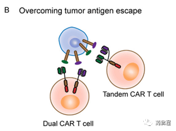 最近,研究人员一直致力于设计多靶CAR T细胞,旨在通过识别多种抗原来抑制肿瘤抗原逃逸。串联CAR T细胞具有两个scFV,可识别连接至一个CAR构建体的不同抗原(图1B)。一组在成胶质细胞瘤小鼠模型中比较了共表达HER2和IL13Rα的串联CAR T细胞与单特异性CAR T细胞的作用,发现前者抑制了抗原逃逸的减少和肿瘤清除率的提高[25]。同时已经开发了同时表达多种CAR构建体的CAR T细胞。同样,另一项研究发现,在自体小鼠模型中,针对三种不同胶质母细胞瘤靶标的三价CAR T细胞在不同患者之间出现抗原异质性,并促进了肿瘤清除[26]。在肿瘤环境中靶向突变抗原或非肿瘤细胞抗原,例如成纤维细胞或肿瘤脉管系统,也可以克服抗原逃逸[27]。如一组所示,识别EGFRvIII的EGFRvIII CAR T细胞抑制了胶质母细胞瘤模型中的肿瘤生长[28]。