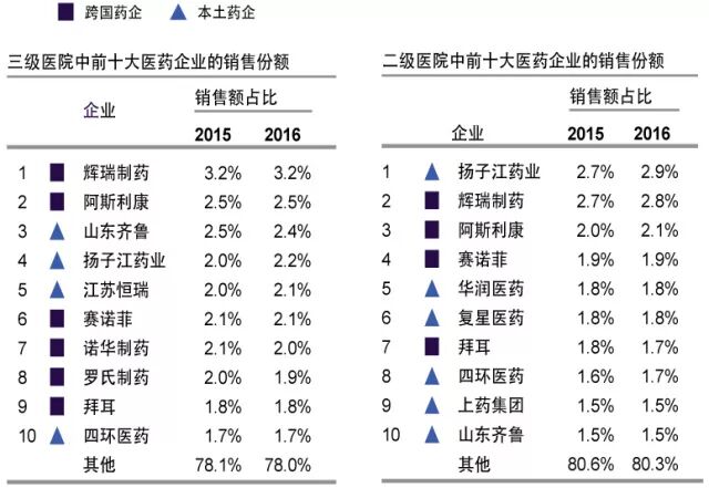 以2015年和2016年的数据来看,销售前十强的企业在三级医院的销售额占比保持在22%左右。前十强中有6家跨国药企、4家本土药企,企业排名相对稳定。