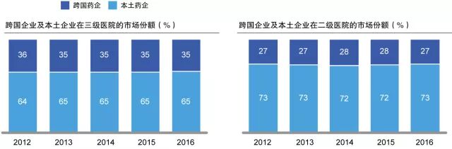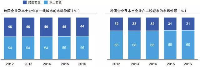 报告显示,2012~2016年间,从二三级医院和一二线城市的销售份额来看,本土药企均高于跨国药企,二者的市场份额相对平稳,在不同等级医院和地域各有优势(图1、图2为跨国药企及本土企业在一线城市和三级医院的市场份额占比)。