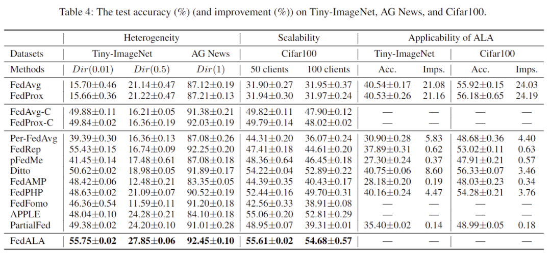 此外,作者也在不同异质性环境和客户机总量情况下评估了 FedALA 的表现。如表 3 所示,FedALA 在这些情况下依旧保持着优异的表现。