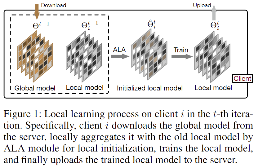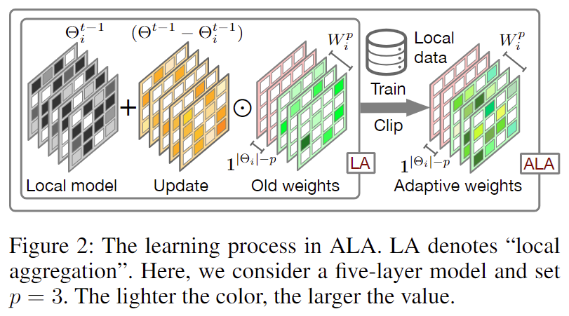 自适应本地聚合(ALA)过程如图 2 所示。相比于传统联邦学习中直接将下载的全局模型