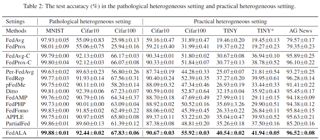 作者在病态(pathological)数据异质环境和实际(practical)数据异质环境下,将 FedALA 与 11 个 SOTA 方法进行了对比和详细分析。如表 2 所示,数据显示 FedALA 在这些情况下的表现都超越了这 11 个 SOTA 方法,其中 “TINY” 表示在 Tiny-ImageNet 上使用 4-layer CNN。例如,FedALA 在 TINY 情况下比最优基线(baseline)高了 3.27%。