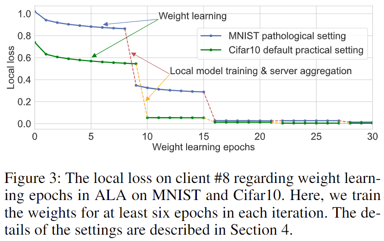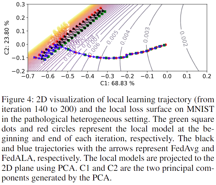 最后,作者还在 MNIST 上可视化了 ALA 模块的加入对原本 FL 过程中模型训练的影响,如图 4 所示。不激活 ALA 时,模型训练轨迹与使用 FedAvg 一致。一旦 ALA 被激活,模型便可以通过全局模型中捕获的其训练所需信息径直朝着最优目标优化。