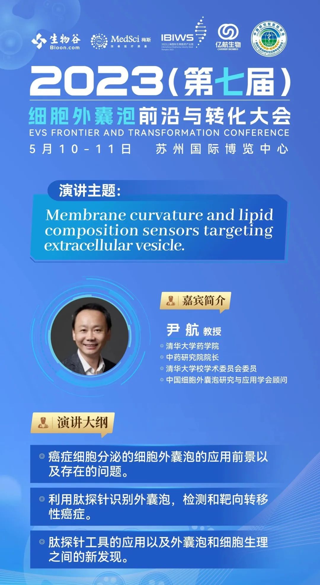 热烈欢迎清华大学药学院尹航教授受邀参加“2023(第七届)细胞外囊泡前沿与转化大会”并发表主题演讲:Membrane curvature and lipid composition sensors targeting extracellular vesicle。