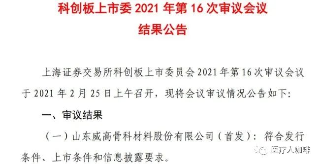 上海证券交易所科创板上市委员会2021年第16次审议会议于2021年2月25日上午召开,山东威高骨科材料股份有限公司(以下简称:威高骨科)符合发行条件、上市条件和信息披露要求,顺利通过审核。