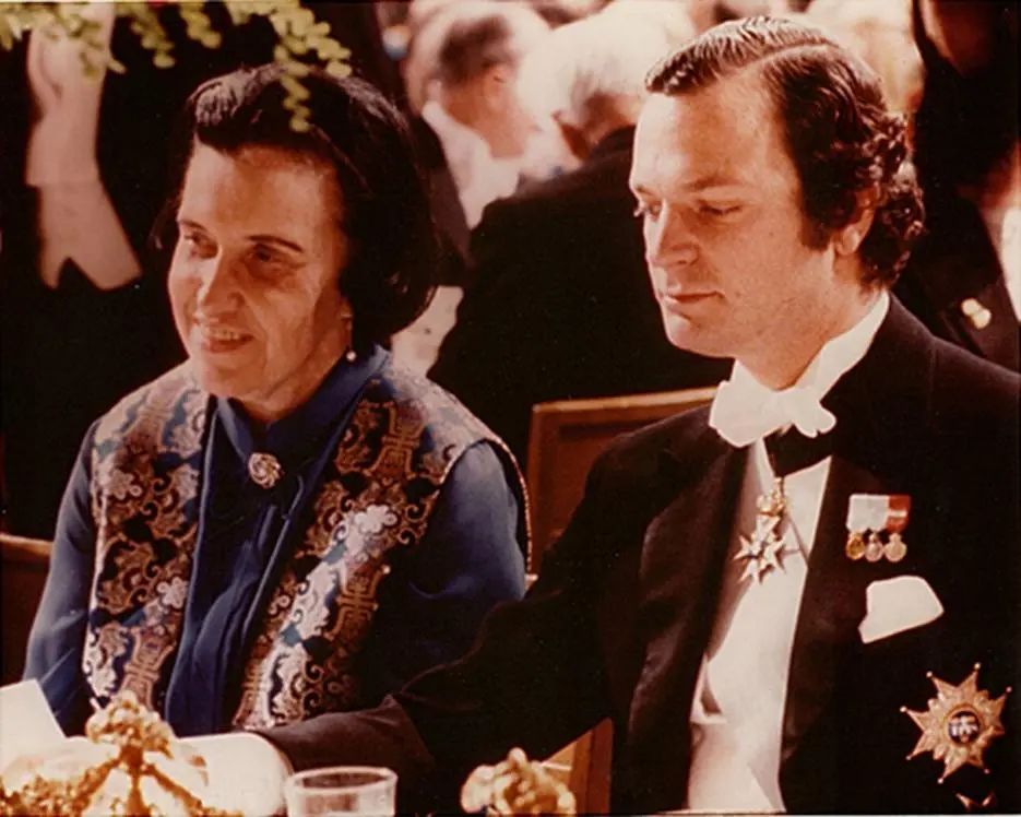 图1. 1977年12月10日,罗莎琳·耶洛在诺贝尔颁奖晚宴上,身旁坐着瑞典国王卡尔十六世·古斯塔夫(Carl XVI Gustaf)。| 图源:William A. Bauman and Benjamin Yalow(罗莎琳之子)