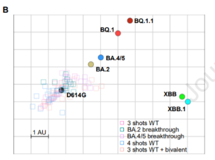 2022年12月初,美国哥伦比亚大学和密歇根大学的学者在《细胞》上发表了一篇文章,研究了奥密克戎谱系BQ/BQ.1.1、XBB/XBB.1变异株的突变位点及其对疫苗的逃逸性情况。