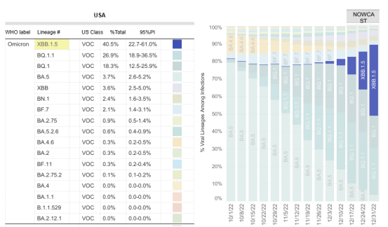 据美国疾控中心(CDC)的于2022年12月31日公布的数据,XBB.1.5毒株占全美新冠感染中的40.5%。