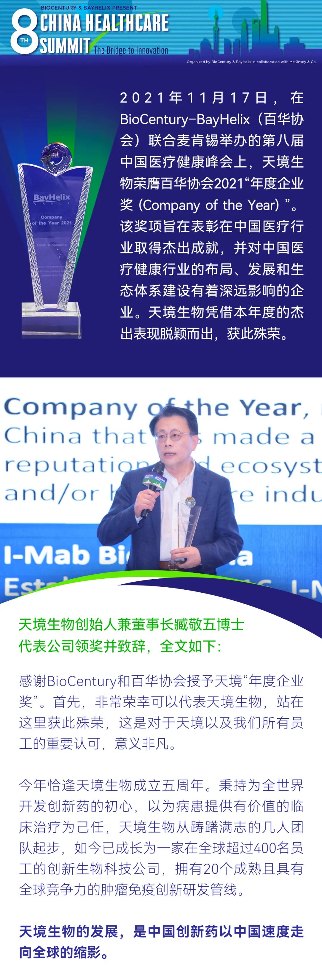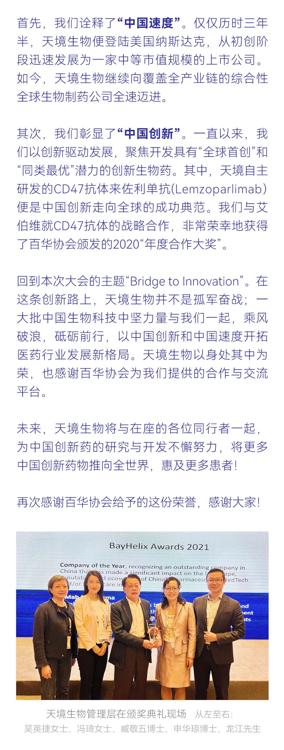 天境生物荣获百华协会“2021年度企业奖 (Company of the Year)”