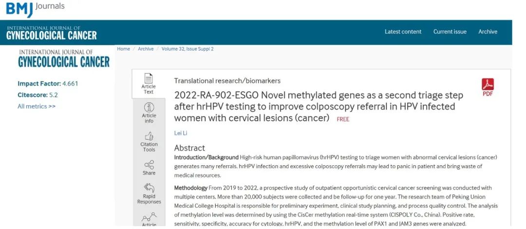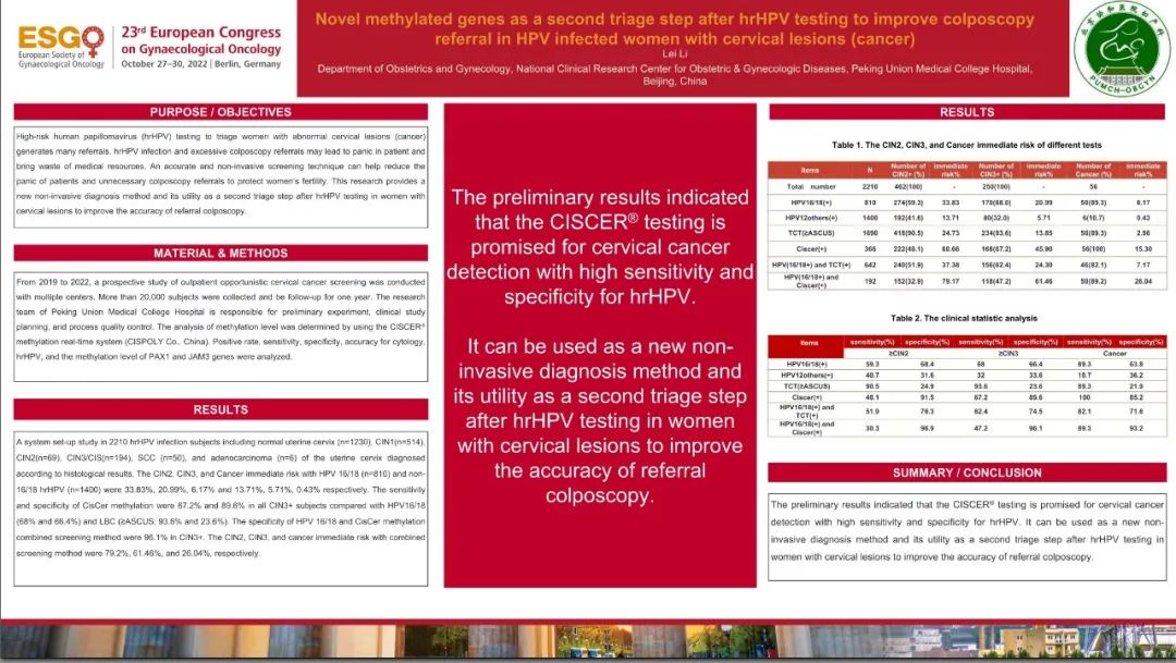 在2022年10月27日~30日在德国柏林举办的第23届欧洲妇科肿瘤学大会(ESGO)上,聚禾生物禾宫康CISCER®以电子壁报(ePoster)的形式分享了最新的研究数据,并同步收录International Journal of Gynecological Cancer (IJGC, IF=4.661)增刊中。