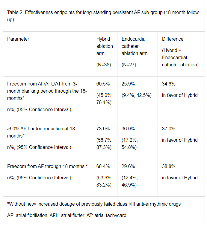 CONVERGE试验18个月的数据表明,hybridAF疗法具有持久、持续的疗效。在治疗组中,长期持续性心律失常患者无心律失常的发生率为61%,而单纯心内膜导管消融患者无心律失常的发生率为26%。混合房颤治疗组18个月时单独使用Afib的自由度为68%,而导管消融组为30%。