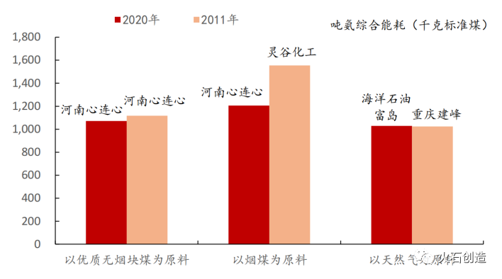 由于企业工艺和规模不同,行业平均能效水平低于“领跑者”10%-20%,龙头企业在能效水平上有显著的优势。国内煤化工龙头华鲁恒升通过不断引进、消化、吸收、再创新,掌握了洁净煤气化技术,形成独具特色的“一头多线”循环经济柔性多联产运营模式,2020年合成氨吨氨能耗1275千克标准煤,位于行业第三;甲醇单位能耗1360千克标准煤,位于行业第二。在煤炭指标收紧的背景下,高能耗的中小企业退出将成为必然,龙头煤化工企业竞争力将进一步增强。