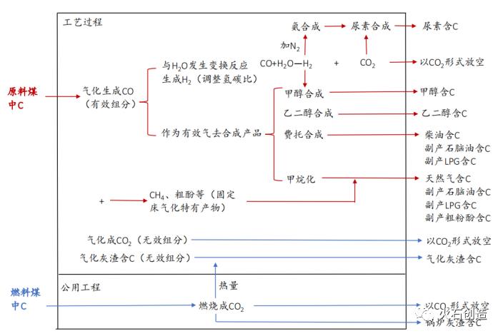 ,煤炭可以分为原料煤和燃料煤两类,原料煤参与化学反应,碳元素的转化有3条路径,一部分进入产品、一部分转化为CO2,剩余少量的碳成为废渣;而燃烧燃料煤产生热能为化工生产提供动能和能量,理论上几乎都转化为CO2。在传统的煤化工的碳利用率上,75%左右的碳元素进入环境,而只有25%的碳元素进入产品,也就是说在煤化工生产中,产品的产量越高,煤炭的消耗就越高,碳排放也就越高。