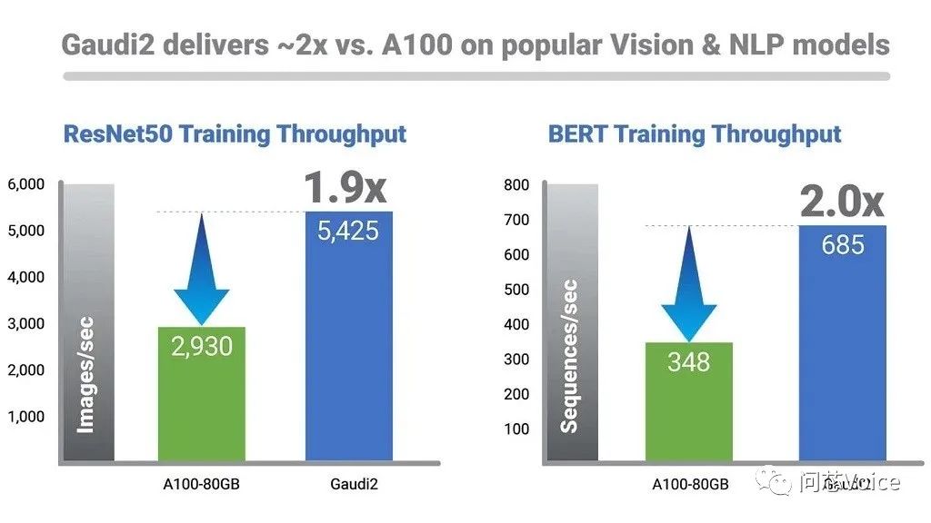 英特尔也端出与英伟达相比的数据,显示 Gaudi2 训练吞吐量是 Gaudi 的 3.2 倍,与英伟达 A100 相比也是将近两倍,更是 V100 的 4.1 倍。