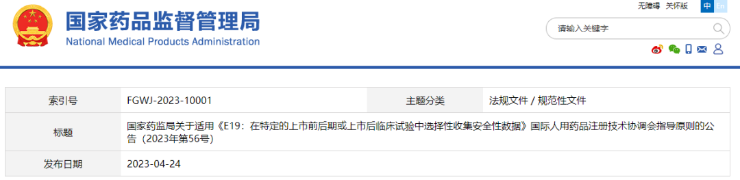 5. 国家药监局:适用《E19:在特定的上市前后期或上市后临床试验中选择性收集安全性数据》国际人用药品注册技术协调会指导原则