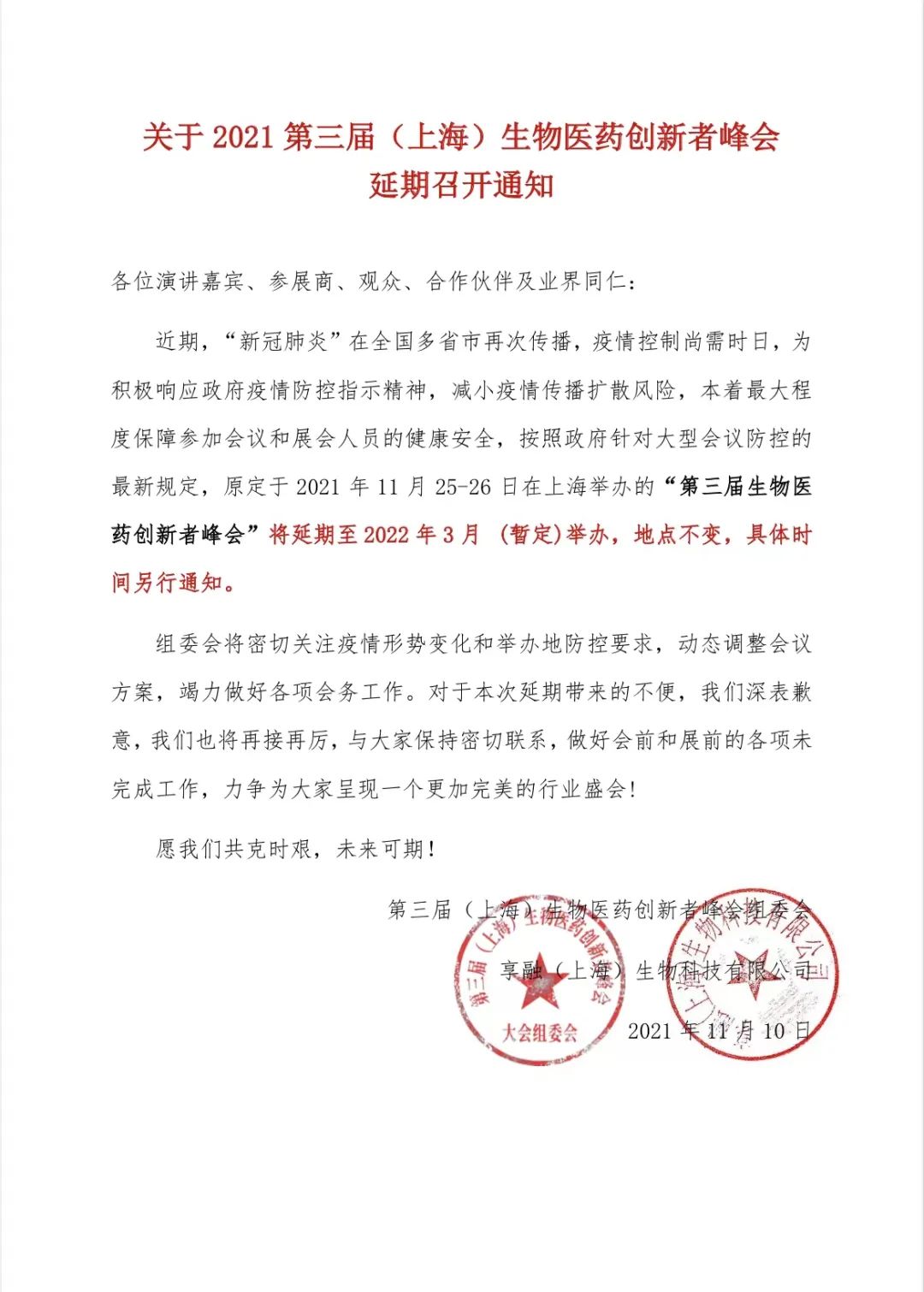 【延期通知】关于延期举办2021第三届(上海)生物医药创新者峰会的通知