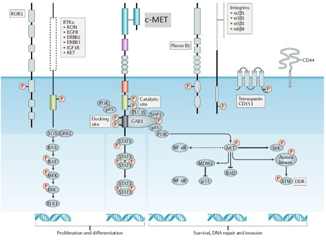 c-Met是表达在细胞表面的受体。c-Met被过度激活,有可能会启动正常细胞向肿瘤细胞转化,并进一步带动其侵袭、转移、扩散等后续事件的发生。c-Met激活的细胞内下游信号通路主要方向包括:细胞增殖和分化、细胞生存、DNA修复等。当结合配体HGF后,c-Met通过形成二聚体和近膜区域若干位点的磷酸化实现活化,激活下游的一系列信号通路,启动相关的细胞生理生化功能。参与和涉及c-Met信号通路的分子,许多都是大家耳熟能详的肿瘤药物研发领域明星靶点,诸如PI3K、GRB2、STAT3、GAB1、SHP2、RAS等,这些靶点的激活往往又会带动其自身相关的更加复杂和庞大的调控网络,可谓牵一发而动全身。近年的不少临床发现也显示,c-Met基因突变正是在许多肿瘤药物耐药的关键所在。