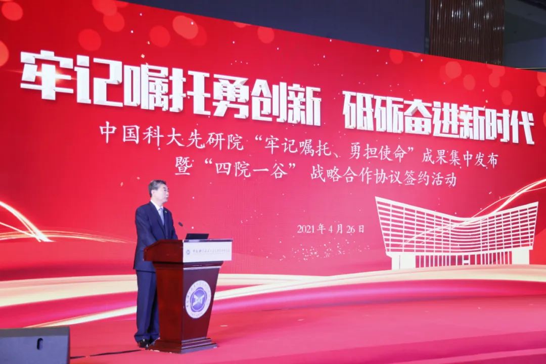2021年4月26日下午,中国科学技术大学先进技术研究院(以下简称“先研院”)举办“牢记嘱托、勇担使命”成果集中发布暨“四院一谷”战略合作协议签约活动。省委常委、常务副省长、省政协副主席邓向阳,中国科学技术大学党委书记舒歌群、校长助理吴枫出席活动。高新区管委会副主任吕波介绍了高新区五年来的发展成就。