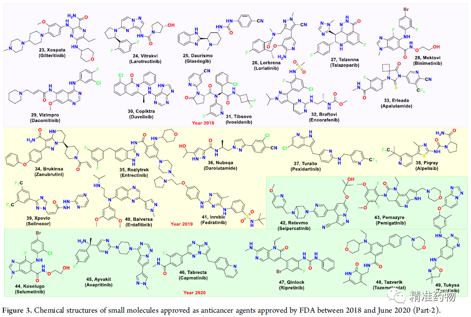 过去五年,FDA批准了总共69种用于治疗各种癌症的药物/药物组合,包括51种小分子(图2和图3)和19种大分子。
