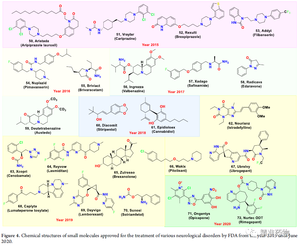 图4 FDA批准用于治疗各种神经系统疾病的小分子化学结构(2015-2020/6)