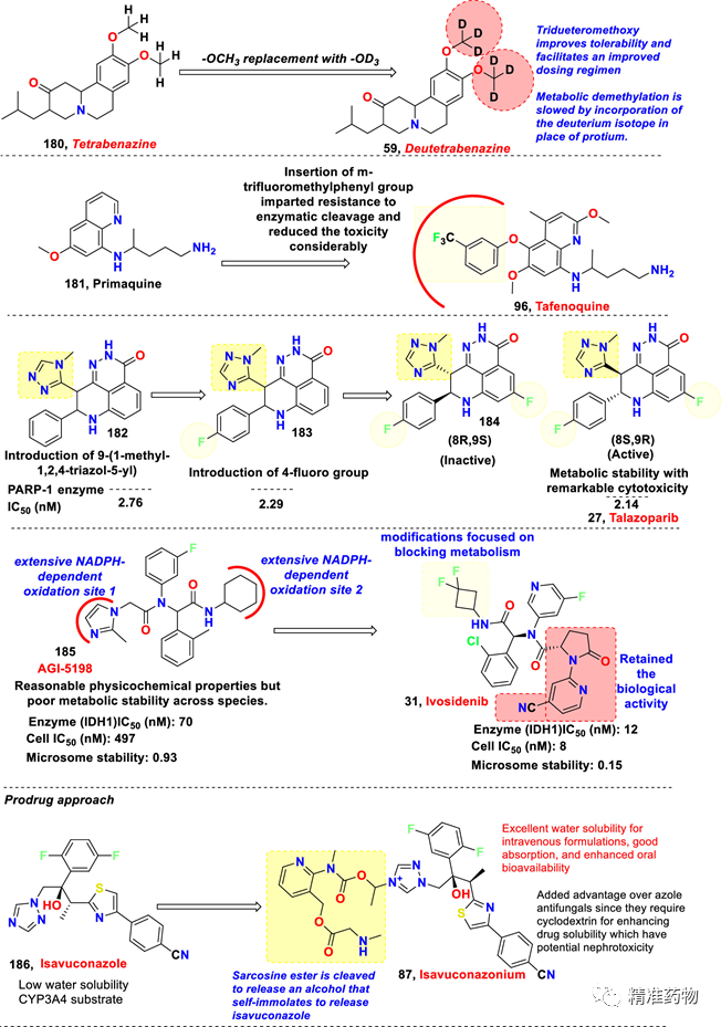 总结FDA批准的药物(图20)时发现一些优化代谢的策略,例如用氘取代四苯嗪的氢,可提高CYP2D6的代谢稳定性,提高半衰期,并减少清除率。而在primaquine中插入m-三氟甲基苯基可使CYP对酶解产生抗性,从而大大降低毒性。此外,图20中还列举了更多用于优化代谢的策略。