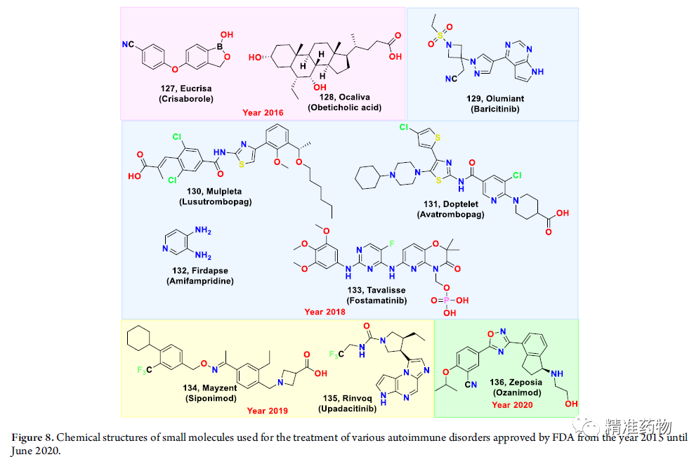 图8 FDA批准用于治疗各种自身免疫性疾病的小分子化学结构(2015-2020/6)