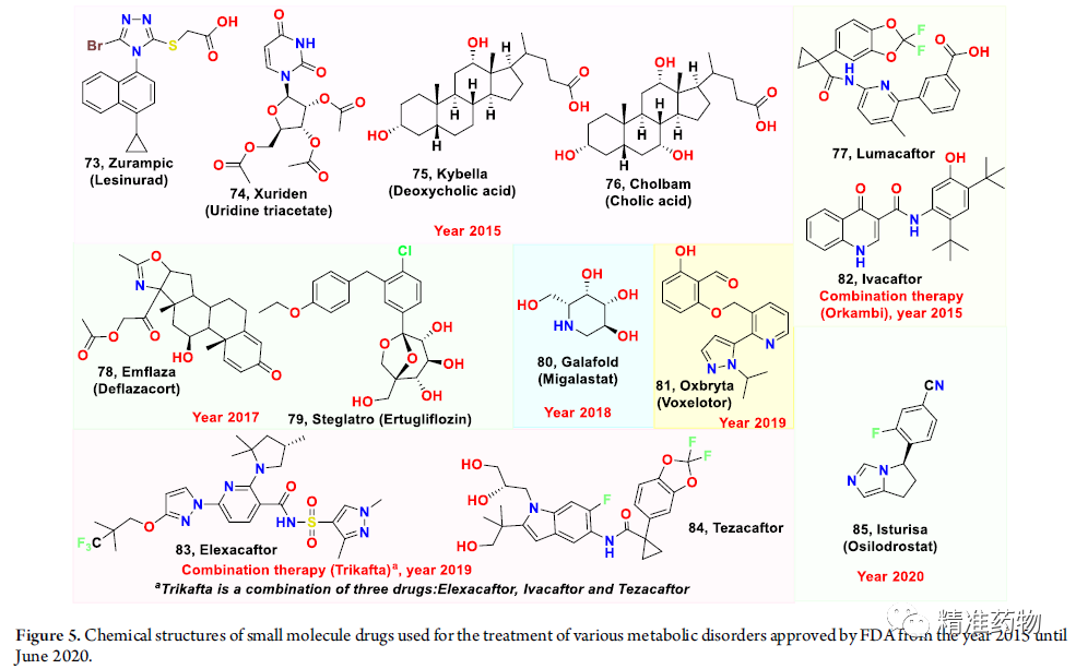 图5 FDA批准用于治疗各种代谢紊乱的小分子药物的化学结构 (2015-2020/6)