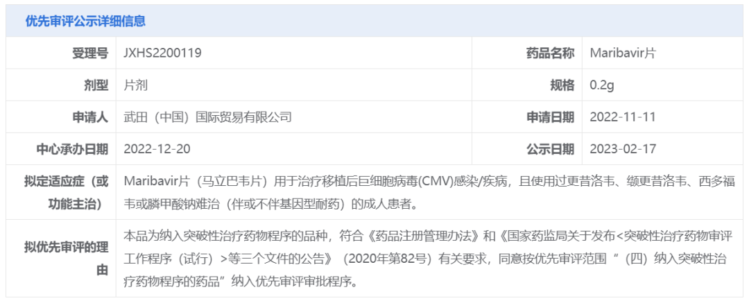 2021年11月,FDA批准马立巴韦上市,用于治疗接受造血干细胞移植(HSCT)或实体器官移植(SOT)后成人或12岁以上儿童患者的难治性巨细胞病毒(CMV)感染,这些患者对已有针对CMV的抗病毒疗法不产生应答。FDA新闻稿指出,这是针对这一患者群体的首款获批疗法。2022年11月,该药也获得欧盟委员会(EC)批准上市。