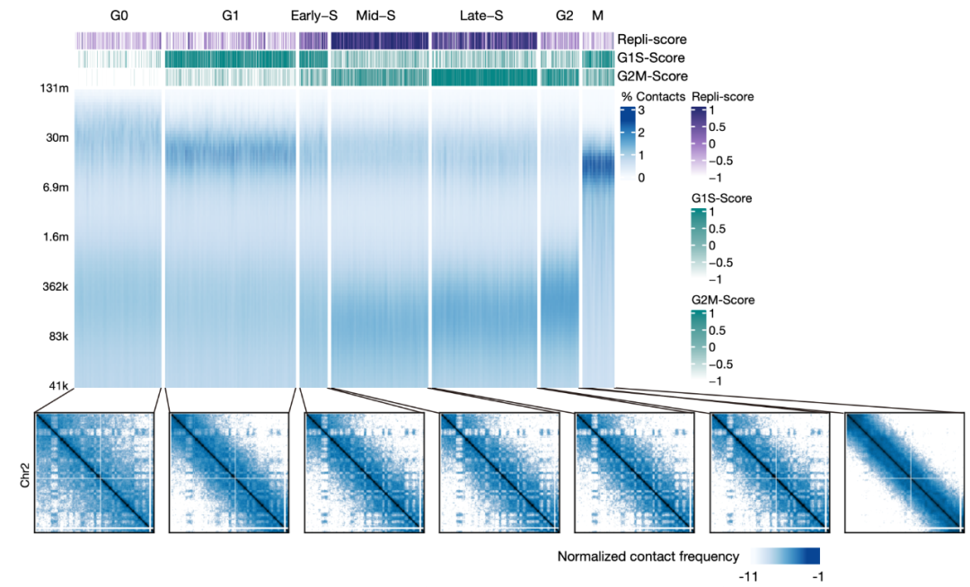 在胚胎组织中,研究人员发现根据染色质结构定义的细胞类群与细胞周期状态之间的一致性更强,说明与细胞周期相关的染色质结构变化对总体的染色质空间构象具有重要影响。在不同的细胞类型之间,该研究开发了一种半定量的比较细胞周期过程中染色质结构的方法,并发现分裂间期细胞的染色质构象由两个独立的过程决定——有丝分裂后染色体的自发展开和基因组的复制。对于G1期较短的细胞类型,这两个过程在时间上可能重叠,从而共同决定了染色质三维结构的细胞周期动态。