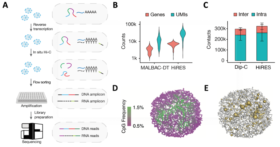 图1 HiRES方法能高效检测单细胞的转录组和三维基因组 (A)HiRES方法流程示意图。(B)MALBAC-DT和HiRES两种方法检测到的基因和转录本数目。(C)Dip-C和HiRES两种方法检测到的染色质相互作用数。(D)示例单细胞染色质三维结构上的染色质区室化情况,可以看到异染色质(洋红色)和常染色质(绿色)的分区。(E)示例单细胞染色质三维结构上的基因表达情况。球的大小代表表达量的高低。