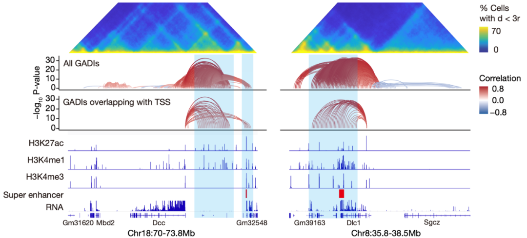 在此基础上,该研究进一步利用染色质相互作用强度与基因表达水平的协同变化,将差异相互作用与其潜在的相关基因联系起来,并将这些与基因表达显著相关的差异相互作用称为GADI(gene-associated DI)。研究发现GADI常常将启动子与远端的调控元件(如增强子、超级增强子)连接起来 (图3)。因此,GADI不仅仅是转录活动的结果,还包含了许多潜在的增强子-启动子相互作用,这些相互作用很可能是控制细胞类型特异性基因表达的基础。