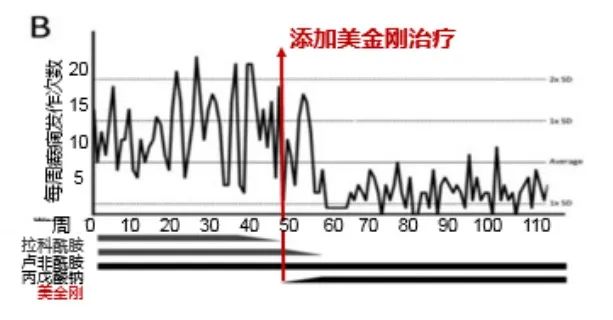 病例报告显示,美金刚还可能减少癫痫性脑病患者的癫痫发作。美金刚辅助治疗一例6岁的GRIN2A突变的早期发作的癫痫性脑病儿童,可改善脑电图表现,减少癫痫发作频率及减少抗癫痫药(Antiepileptic drug,AED)的使用(见图2)13。美金刚治疗的2例GRIN2D相关癫痫性脑病患儿发作减轻14。