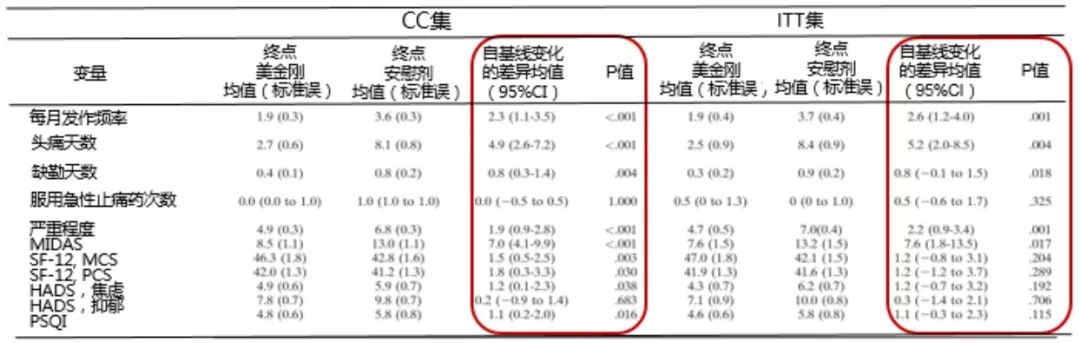 注:CC:研究人群;ITT:意向性分析人群;MIDAS:偏头痛失能程度问卷评分;SF-12:健康调查 12 条简表;MCS:精神健康总评分;PCS:躯体健康总评分;HADS:医院焦虑抑郁量表;PSQI:匹兹堡睡眠质量指数