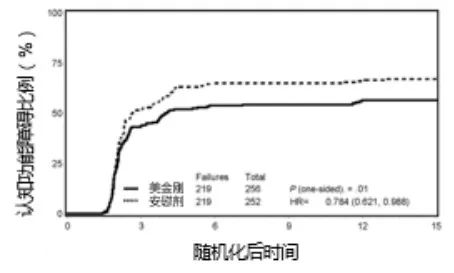 图3 美金刚显著延迟WBRT后出现认知障碍的时间(HR 0.78, P=0.01)