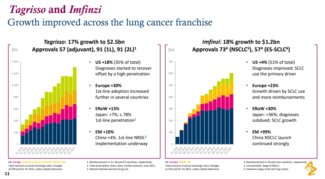 根据阿斯利康半年报,Imfinzi 在 2021H1 获得 12 亿美元收入,增长 18%。目前,该药获批的适应症包括不可切除 III 期 NSCLC、广泛期小细胞肺癌以及膀胱癌,随着适应症的拓展势必获得更强的增长驱动力。