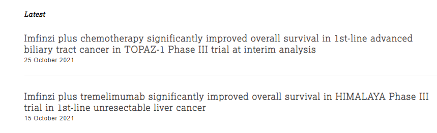 10 月 25 日,阿斯利康宣布,其 PD-L1 单抗度伐利尤单抗(Imfinzi)联合化疗一线治疗晚期胆道癌(BTC)的 III 期临床 TOPAZ-1 在中期分析中达到了总生存期(OS)主要终点。