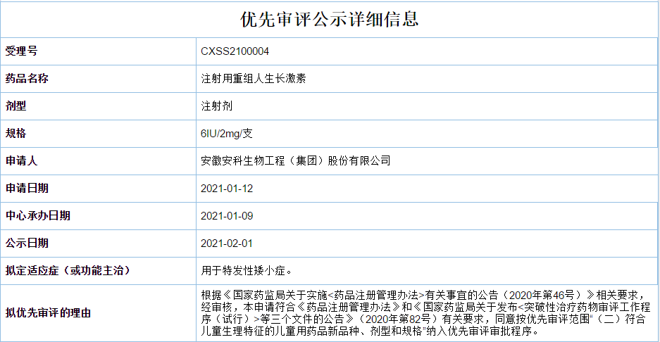 2月1日,CDE官网显示,安徽安科生物注射用重组人生长激素新适应症上市申请拟纳入优先审评,用于治疗特发性矮小症(ISS)。
