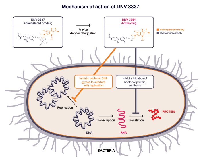 目前,DEINOVE 正在进行多项开发计划,其第一个抗生素候选药物 DNV3837 适应症为严重艰难梭菌感染,目前已进入 II 期临床试验。今年 4 月,临床试验由美国扩展至加拿大,新增了 5 个新站点。DNV3837 是一种水溶性前药,在人体静脉内给药后会迅速去磷酸化,从而产生药物的活性形式 DNV3681。其结构由两个活性部分组合而成:抑制细菌 DNA 促旋酶以干扰细菌基因组复制的氟喹诺酮和抑制细菌蛋白质合成起始的恶唑烷酮。