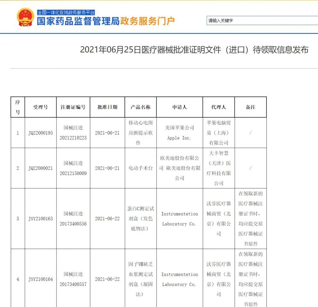 国家药品监督管理局今天发布了 2021 年 06 月 25 日医疗器械批准证明文件(进口)待领取信息,其中第一项是美国苹果公司 Apple Inc 的移动心电图房颤提示软件,注册证编号为国械注进 20212210223。