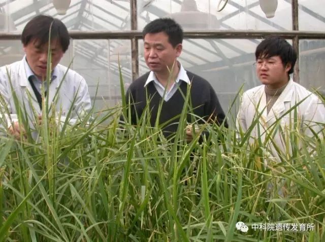 李家洋研究员 (中) 在温室与学生一起察看水稻材料